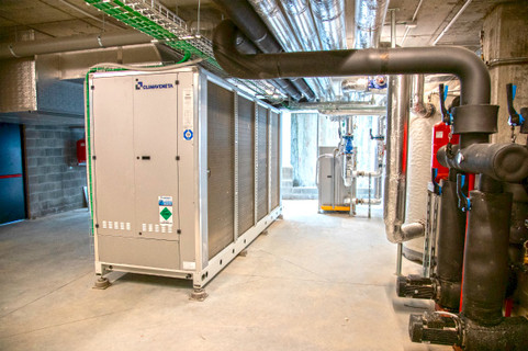 La produzione dei fluidi caldi e freddi avviene grazie a una pompa di calore condensata ad aria NECS-CQ/B/S 0804 di Mitsubishi Electric a marchio Climaveneta, collocata nell’interrato, per evitare installazioni a vista. L’aria di espulsione viene liberata attraverso grandi griglie poste in copertura dei locali tecnici ed esternamente poco visibili, perché installate in posizione defilata rispetto all’accesso principale dell’edificio. Questo da una parte ha permesso di soddisfare le richieste del cliente di avere impianti altamente tecnologici ma di basso impatto e dall’altro ha comportato però un uso intensivo degli spazi tecnici posti al livello -1. Per la produzione di acqua calda sanitaria ad altissima temperatura è inoltre stata installata una pompa di calore EW-HT 0152 sempre di Mitsubishi Electric a marchio Climaveneta. Vista la molteplicità delle funzioni svolte all’interno dell’edificio, è stato scelto di distribuire in ambiente il freddo con UTA, e il caldo con un sistema di pannelli radianti a pavimento, per garantire le condizioni di comfort ideali nel periodo invernale nel museo e nelle aule.